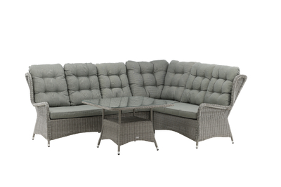 Washington är ett exklusiv soffa med en kombination av tidlös design och en fantastisk komfort – den kommer garanterat göra succé på din uteplats eller altan i sommar. Soffgruppen består av en hörnsoffa med 5 sittplatser och en hörndel samt ett högre soffbord med en avlastningshylla och en bordsskiva av glas.